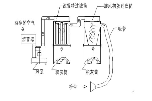 ③ 吸鋼砂用工業(yè)吸塵器是旋風初效過濾筒可過濾95%以上的鋼砂與粉塵,含塵氣流經(jīng)收縮形進口,切向進入初效過濾筒時,由上向下作螺旋形旋轉(zhuǎn)運動,塵粒在離心力的作用下被拋向器壁,鋼砂和比重較大的粉塵沿器壁下旋,進入特殊結(jié)構(gòu)的密封收塵裝置內(nèi);凈化后的氣體由下向上作內(nèi)螺旋形旋轉(zhuǎn),較輕較小的粉塵經(jīng)管道進入濾袋除塵器。